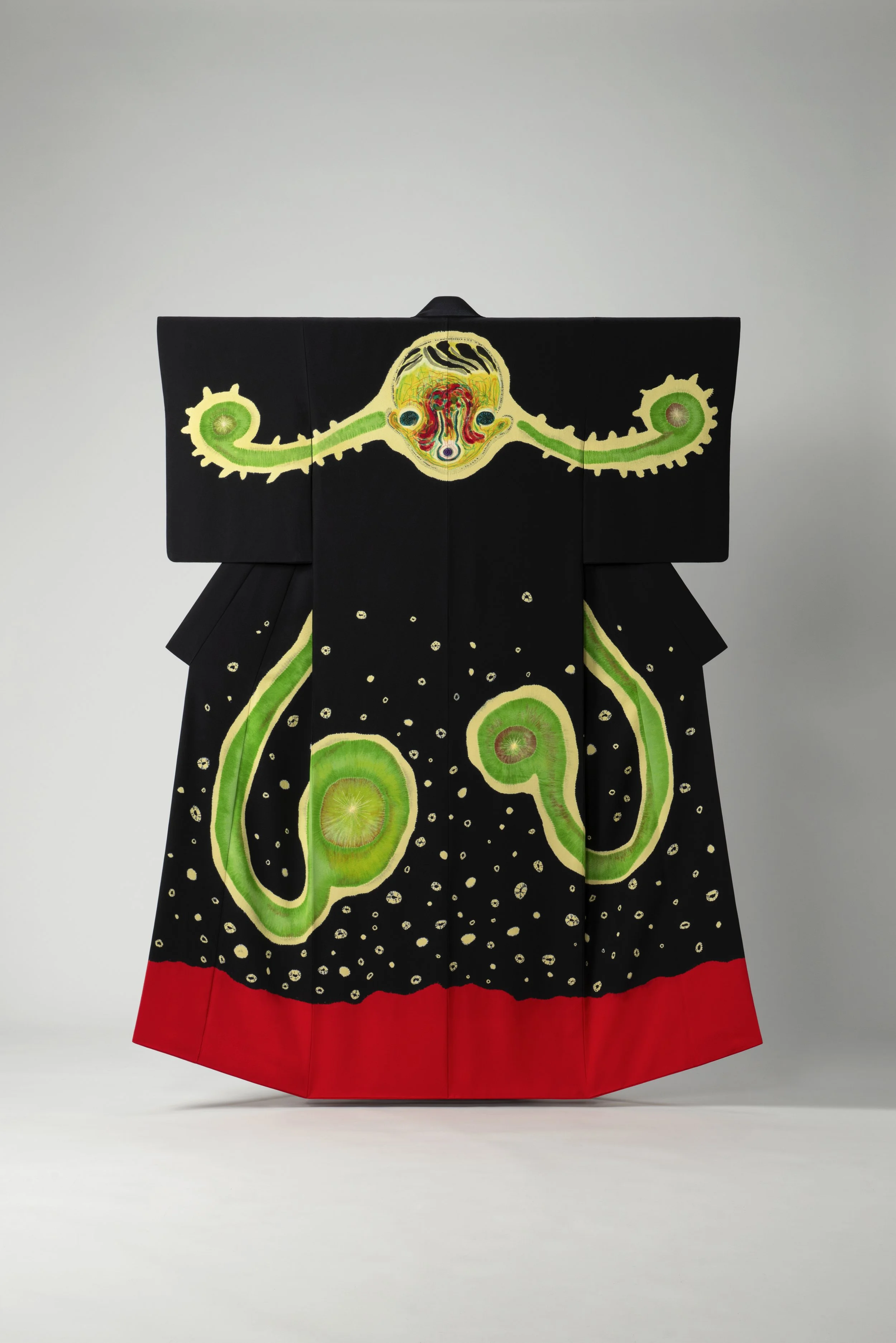 This project began several years ago and came to fruition after extensive experimentation. Notably, the kimono-shaped works were crafted based on Kato’s sketches, employing 20 to 30 traditional processes such as Itome Yuzen, hand-painted Yuzen, shibori tie-dyeing, embroidery, and tailoring. These creations involved the collaboration of over 20 highly skilled artisans based in Kyoto.